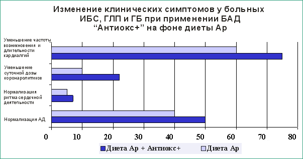 Ар, получали дополнительно БАД "Лайфпак+".В результате лечения в опытной группе у больных значительно реже возникала головная боль, исчезли такие симптомы как слабость, утомляемость, сердцебиение, уменьшилась одышка при физической нагрузке.