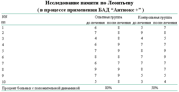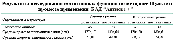 В результате клинических испытаний, проведенных в Клинике лечебного питания НИИ Питания РАМН (г. Москва), было выявлено, что БАД "Антиокс+" обладает выраженной антиоксидантной активностью. Было обследовано 57 больных в возрасте от 28 до 59 лет, страдающих гипертонической болезнью, ИБС. Контрольная группа в количестве 40 человек получала только гипонатриевую диету типа Ар. Больные опытной группы (17 человек) на фоне применения антиатеросклеротической диеты получали по 1 капсуле 2 раза в день БАД к пище "Антиокс+", включающей селен, цинк, бета-каротин, витамины Е и С, а также экстракт виноградной выжимки, гинкго двудольную.