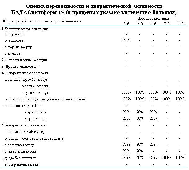 В результате клинических испытаний, проведенных в Клинике лечебного питания НИИ Питания РАМН (г. Москва), было выявлено, что БАД "Свелтформ+" снижает избыточную массу тела и регулирует аппетит. Было обследовано 40 больных в возрасте от 28 до 55 лет, страдающих гипертонической болезнью I ст. и ожирением I - II ст. Контрольная группа в количестве 20 человек получала только гипонатриевую диету типа Ар. Больные опытной группы (20 человек) на фоне применения антиатеросклеротической диеты получали по 1 капсуле 2 раза в день БАД к пище "Свелтформ+", включающей гарцинию камбоджскую, камелию китайскую, фукус пузырчатый, витамин С и хром в составе дрожжей.